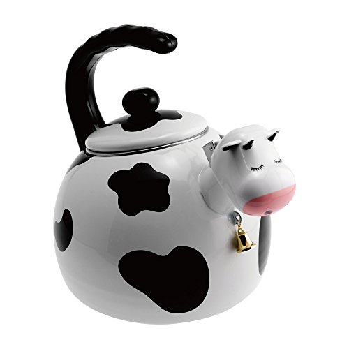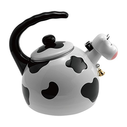 Add fun to your kitchen decor with this Cow Whistling kettle. It whistles when water reaches boiling. The kettle has heavy-gauge stainless steel with enamel finish, plastic handle and even a tiny cowbell.