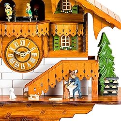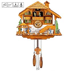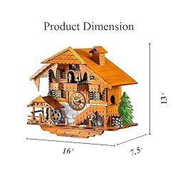 This Cuckoo wall Clock has a real function Cuckoo clock pendulum. When time’s up: cuckoo pops out and calls with echo, music rings (12 different songs), dancers dance, watermill rotates.