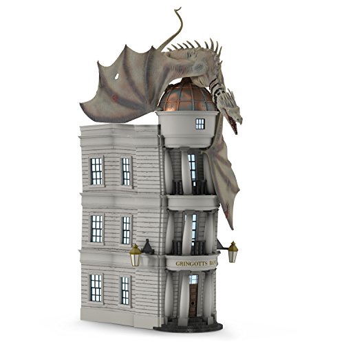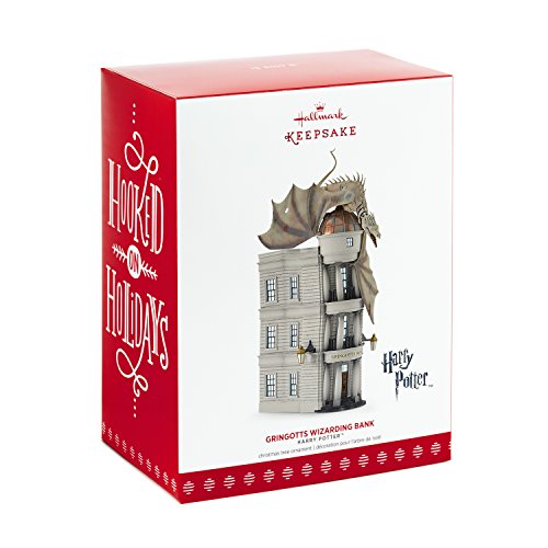 Featuring the dragon perched atop the goblin-run bank, this Christmas ornament lets you add a magical twist to your holidays-simply attach to a light string on your tree to illuminate the windows. This ornament comes ready to give in a seasonal holiday gift box. The box can also be used for ornament storage.