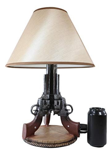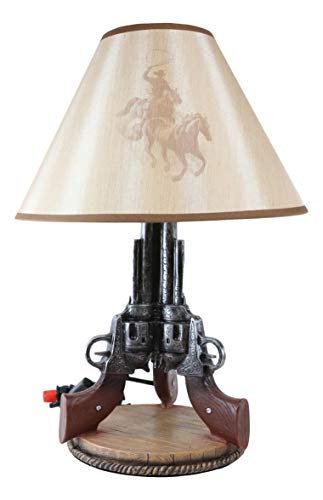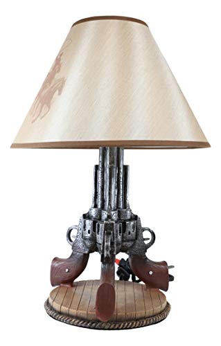 This Guns Base Table Lamp is made of polyresin, hand painted and polished, the quality finish is superb! It comes with the fabric shade as pictured. The shade is 8″ tall and 13″ in widest diameter. The overall Western Triple Six Shooters Revolver Gun Table Lamp measures about 20″ tall. The 3 revolvers lamp body measures 14.5″ tall and 9″ in wide and 8.25″ deep approximately.