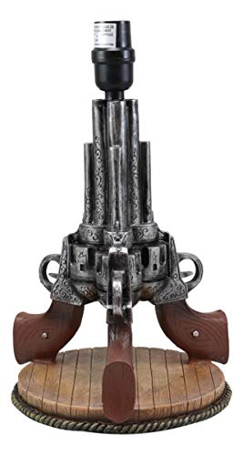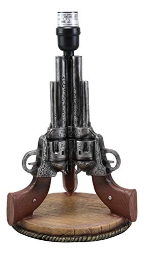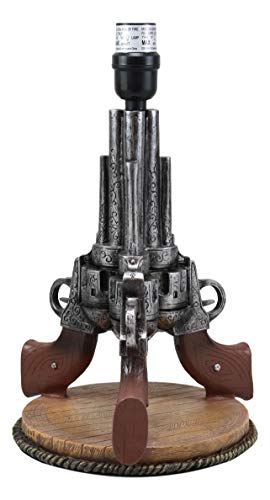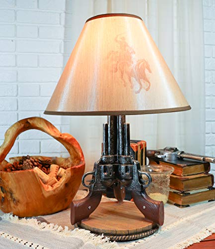 It uses only Type A light bulb (not included), Max 40 watt. Approx. 4 1/2 ft. UL Approved electric cord with a rocker on/off switch. This decorative desktop or table lamp adds a well lit frontier touch to any room decorated with Western or Southwest themed home accents. This western decoration is always a sensation for cowboys or lovers of the wild west. Featuring well detailed 3 revolver guns pointing up toward the sky supported by a round faux wood plank base. This lamp will illuminate your room with Western Charm!