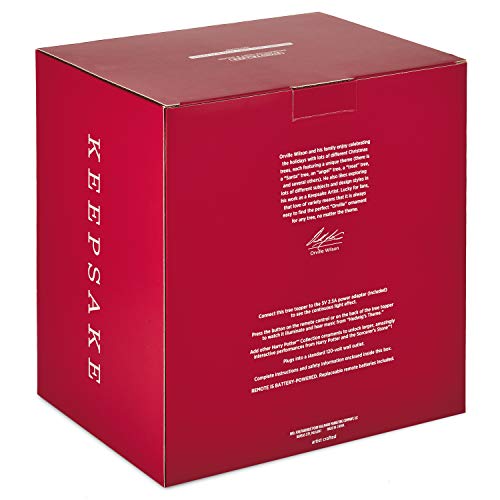 Plug it into a standard 120-volt wall outlet (power adapter included) for constant illumination, then press the button—either on the included Hogwarts crest remote control or on the back of the tree topper—to start a sound and light show scene featuring music from “Hedwig’s Theme.”