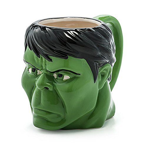 This Hulk Marvel Molded Mug features the irradiated form of Bruce Banner’s head as a cool ceramic mug. Not dishwasher safe. Do not microwave. It holds up to 16 ounces of liquid.