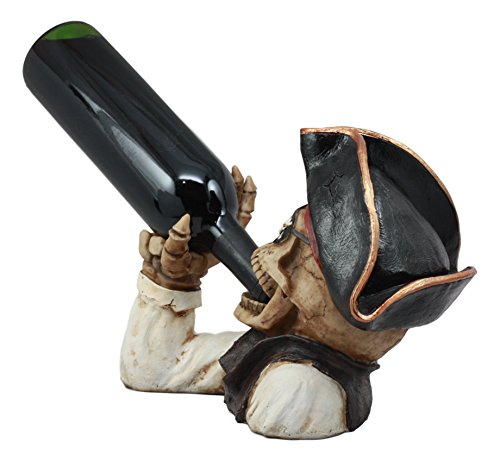 This wine holder features a detailed pirate skeleton head with shoulder and arm poised to hold 1 inverted wine bottle, offering a quirky and convenient display and storage option for homes and spaces. It is designed with a black pirate hat, wearing a white shirt, a black crossed bones skull eye patch, a black jacket and a black body belt.