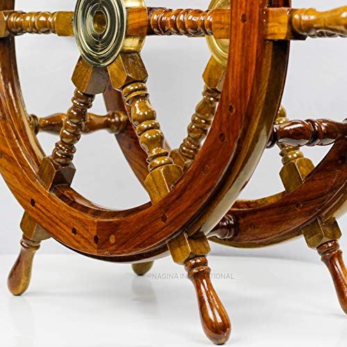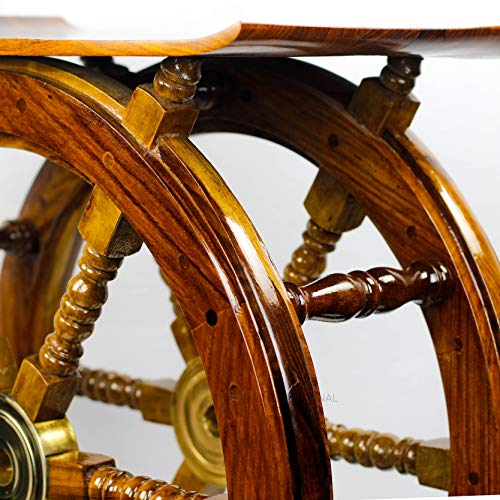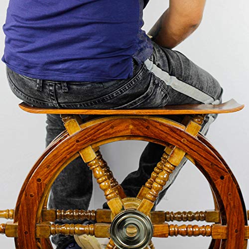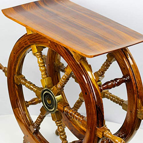 This solid wood ships wheel end table is 61cm wide. The centre of the wheels are constructed of brass and the table surface is made of 100% Sheesham wood. This beautiful Pirate Ship Wheel End Table is hand crafted, hand sanded with flawless finish.