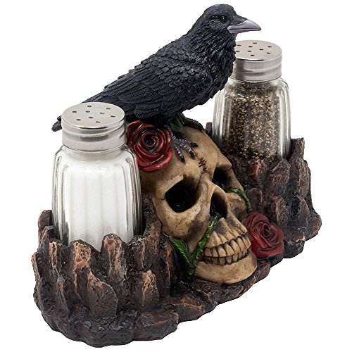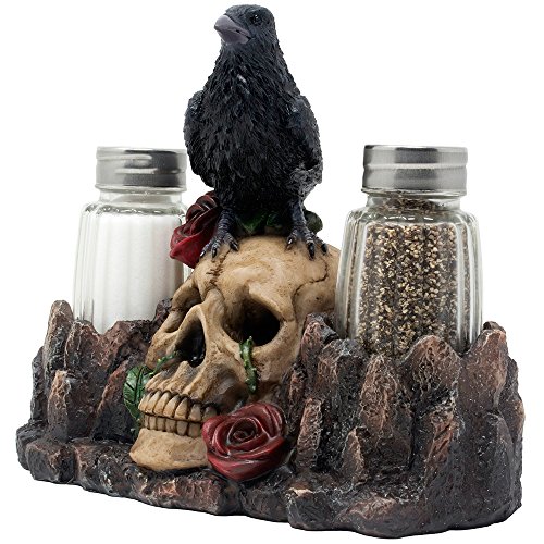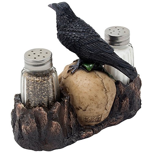Add an amusing bit of fright to your dinner table with this gravely scary black raven on human skull salt and pepper shaker set. Three piece set includes one evil skull figurine as the display stand holder for two glass salt & pepper shakers. It is individually hand-crafted from cold cast resin with glass salt and pepper shakers. Due to individually hand-crafted works of art, colors may vary slightly from what is pictured here.