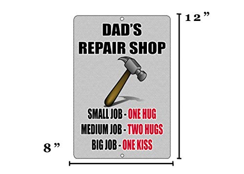 A man cave, garage, workbench, or any other small space will benefit from this detailed and funny sign. Made of durable aluminum, this “Funny & Cute Dads Repair Shop Sign” is perfect for indoor or outdoor display. It’s a great gift for Dad, Father’s Day, or Christmas! Perfect for any father who likes to fix and repair things!