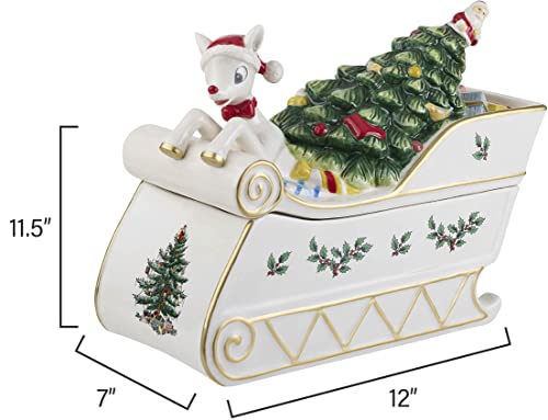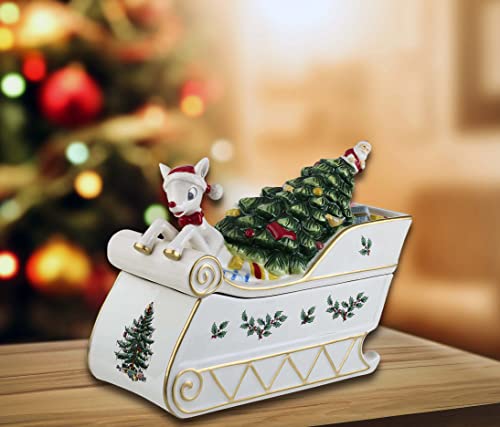 Introducing the whimsical and nostalgic Rudolph the Red-Nosed Reindeer collection, featuring a cookie jar for storing holiday treats and a centerpiece on the table. The Spode Christmas Tree is featured prominently on this beautiful sleigh brimming with gifts. Young and old alike will be delighted by this collection.