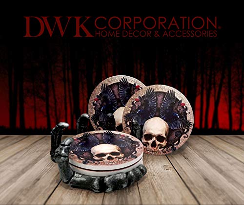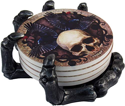 These stunning gothic artwork coasters depict an ancient skull flanked by two flying ravens, the harbingers of death. Hand is meticulously sculpted to capture every exceptional detail, and hand-painted in a beautiful antique pewter finish. Made to last from durable, high-quality, cold-cast polyresin. They are classy enough to display year-round as part of your gothic collection and the perfect addition to your Halloween party decor.