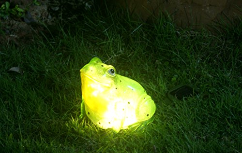Adds a decorative touch to your backyard, patio or garden, while taking advantage of solar energy with Frog with LED Glowing Shells. The hand painted polyresin frog will complement your garden by day and a green LED frog shells will illuminate at night.