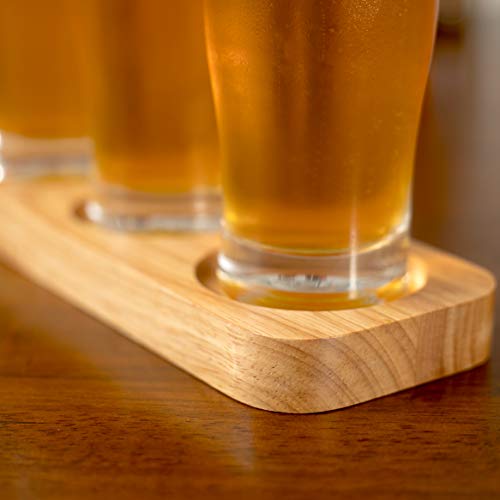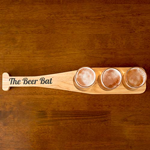 The bat has 3 round holes and a set of glasses that fit perfectly into each hole. It’s a fun and unique way to sample different beers including craft beers, IPA’s, stouts, ciders or could also be used to sample wine, whiskey and other exotic liquors.