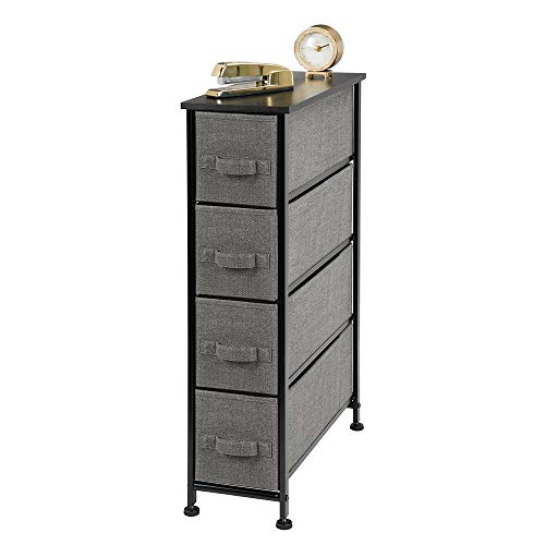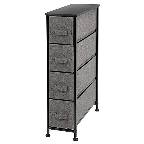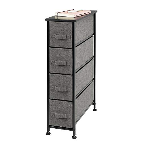 The slim dresser is made of breathable non-woven synthetic fabric; strong steel frame and durable MDF wood top and plastic feet to protect floors.