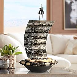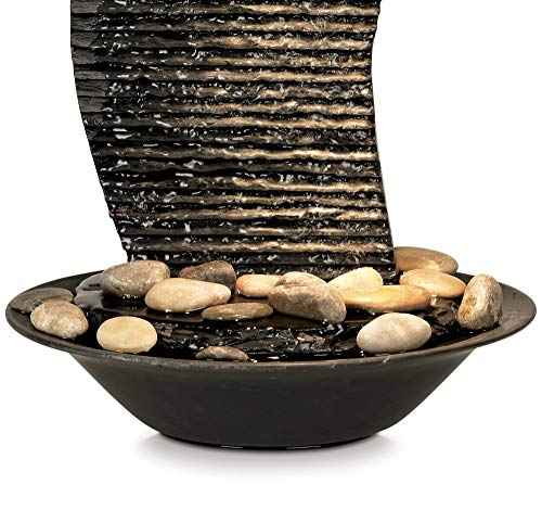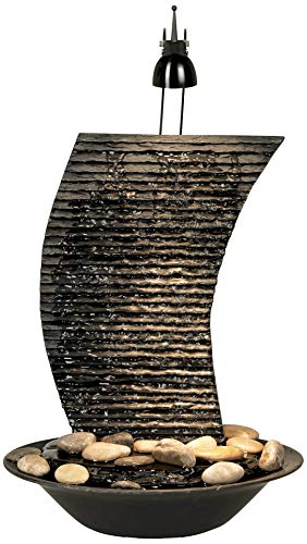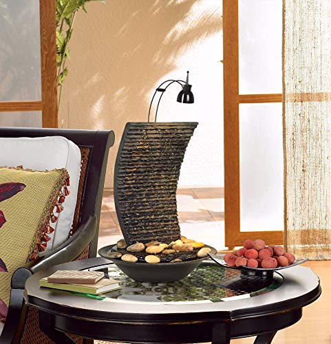 Ideal for use in a meditation room, office, or anywhere you need a bit of tranquility, the design features a textured backsplash that water trickles down into the lower bowl basin. Real river rocks are included that you can arrange in the bowl. A built in light that uses a replaceable halogen bulb illuminates the fountain at night.