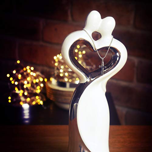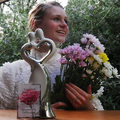 Bring back the romance with this enchanting symbol of your love with this wedding statue! This silver and white ceramic wedding statue features a couple embracing with a heart. Added to this is a cross hanging between the two lovers, held by a chain which can be meaningfully placed over the statue during the wedding ceremony. It features an inspiring prayer card with a meaningful poem.