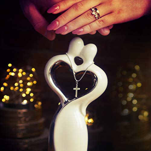 The wedding statue is made of hollow ceramic. It is 9.9 inches tall and 4.1 inches wide (25.2cm X 10.5cm). The cross hangs on a delicate silver bead chain with a silver connector. The necklace can be removed and can be used as a wonderful part of your ceremony, signifying the uniting of couple before God.